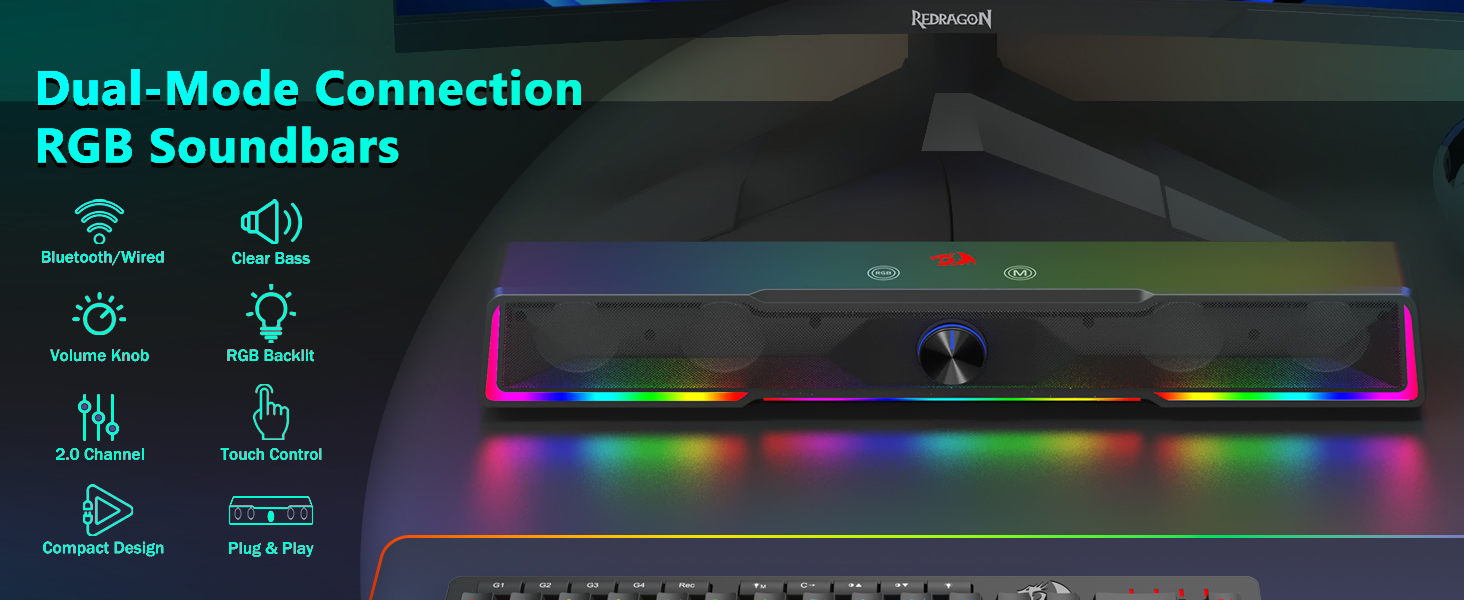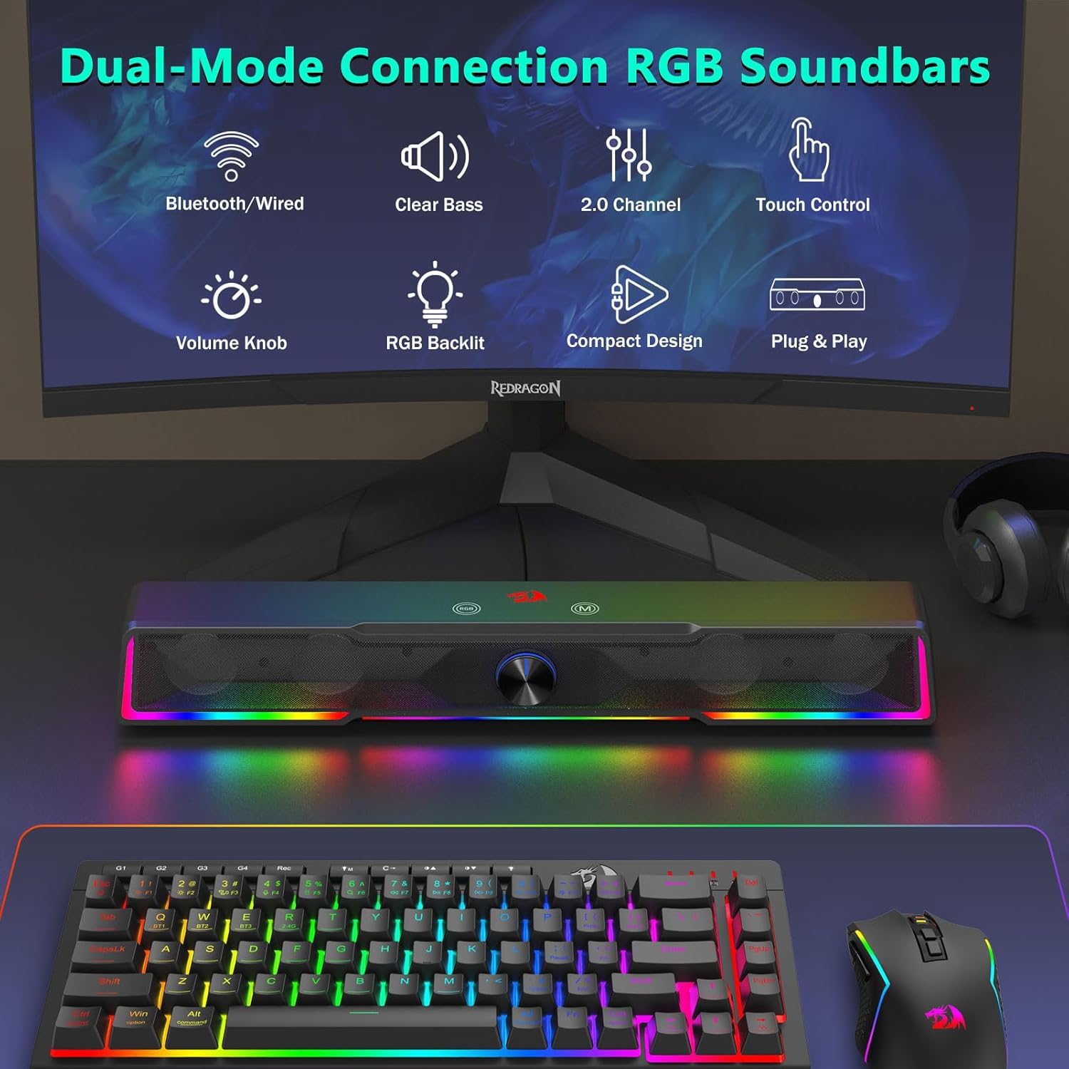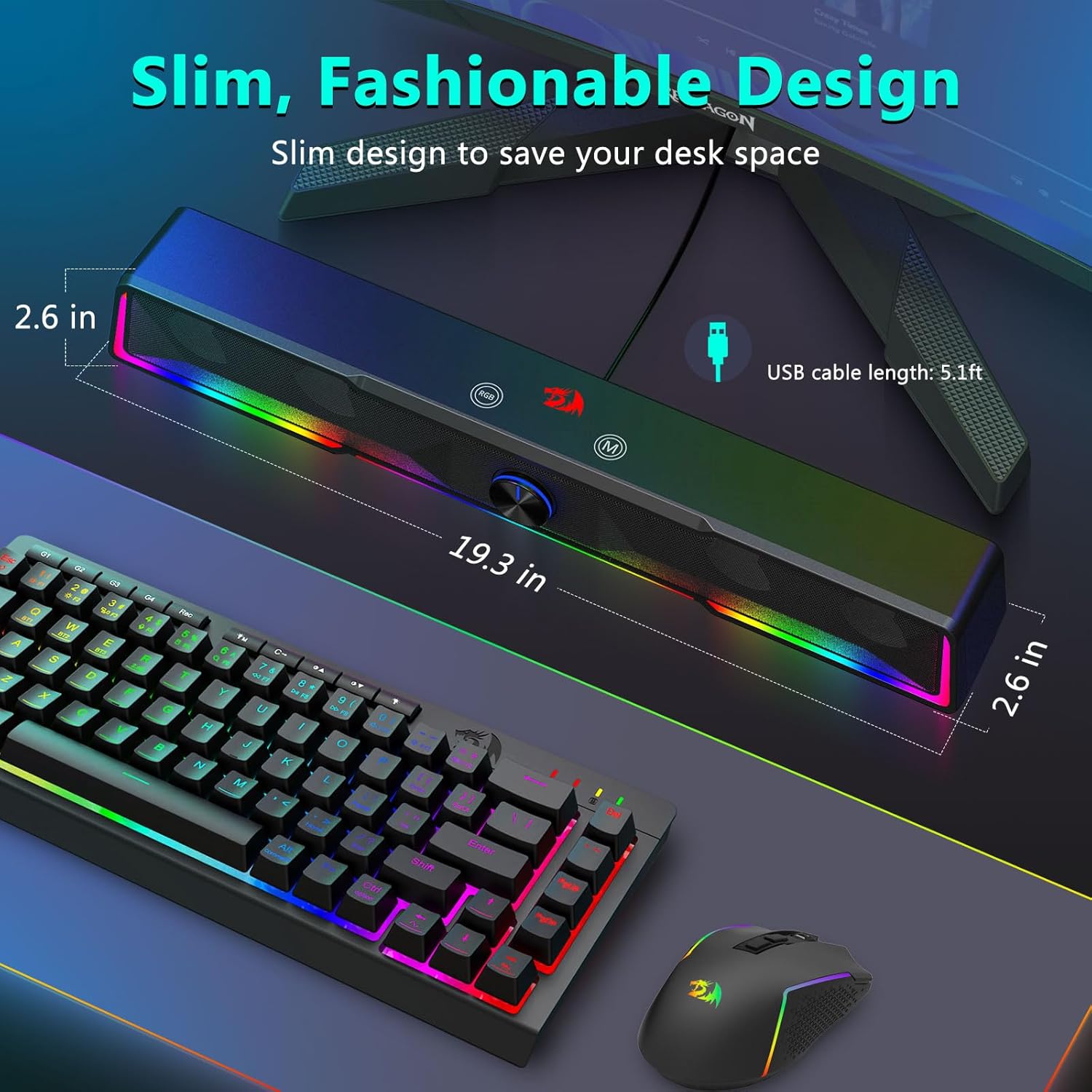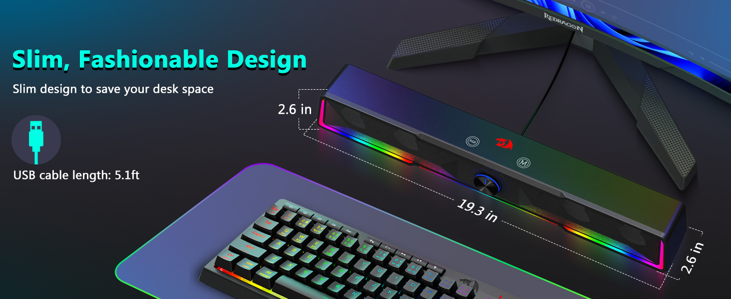 Ruimtebesparend Soundbar-ontwerp In tegenstelling tot traditionele luidsprekers die grote oppervlakken aan beide zijden van een monitor beslaan, heeft de zwarte GS516 Soundbar met Bluetooth/USB-kabelverbinding en volumeknop computerluidspreker een slanke soundbar-structuur die gemakkelijk onder de meeste computerschermen past. Dit compacte ontwerp zorgt voor een opgeruimde en georganiseerde bureauomgeving en levert toch rijke en meeslepende audio.