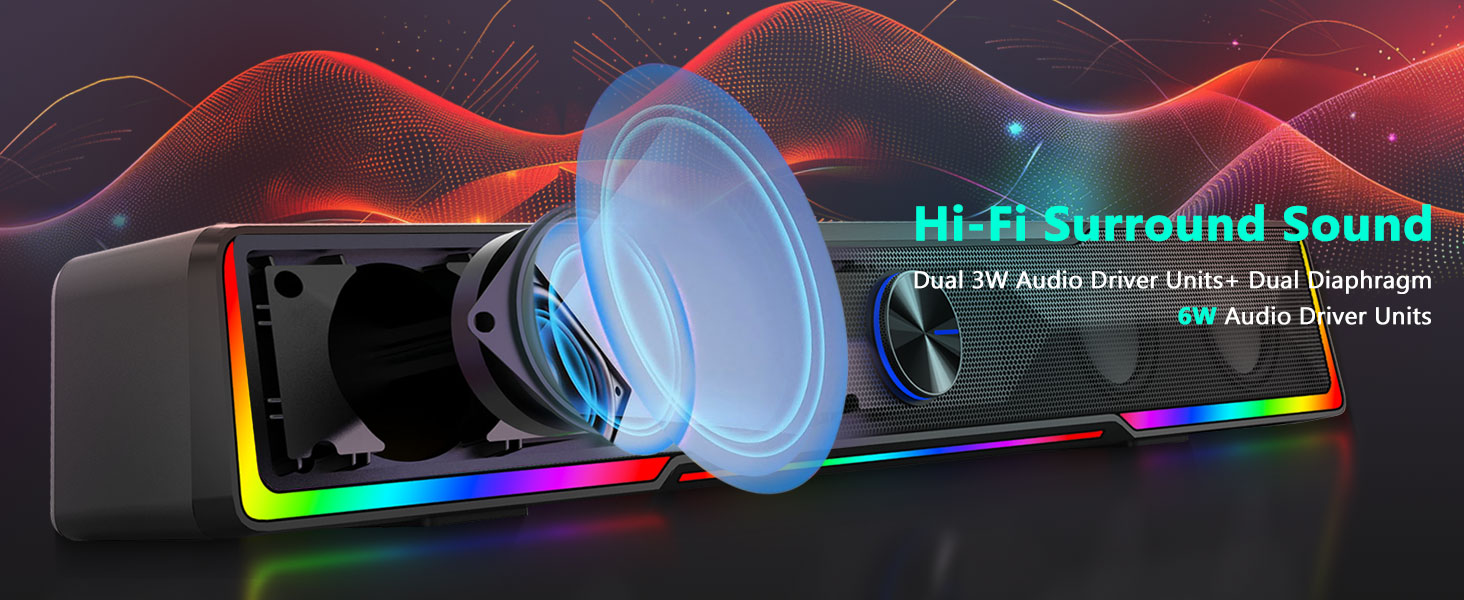 Stereogeluid van hoge kwaliteit Uitgerust met krachtige stereodrivers, levert de zwarte GS516 Bluetooth/USB Wired Connection Soundbar-computerluidspreker met volumeknop een gebalanceerd geluid met heldere zang, gedetailleerde middentonen en verbeterde basrespons. De luidspreker is ontworpen om meeslepende audio te produceren voor meerdere soorten inhoud, waaronder films, games, podcasts en muziek.