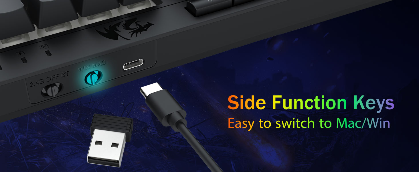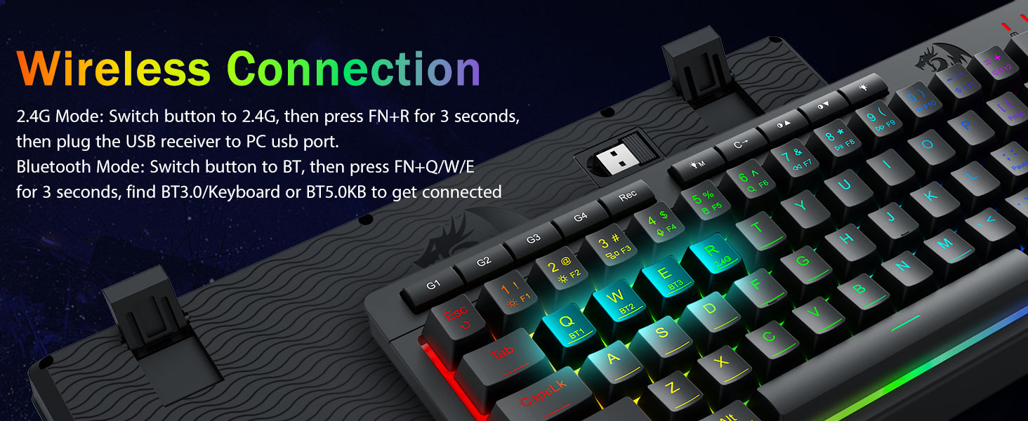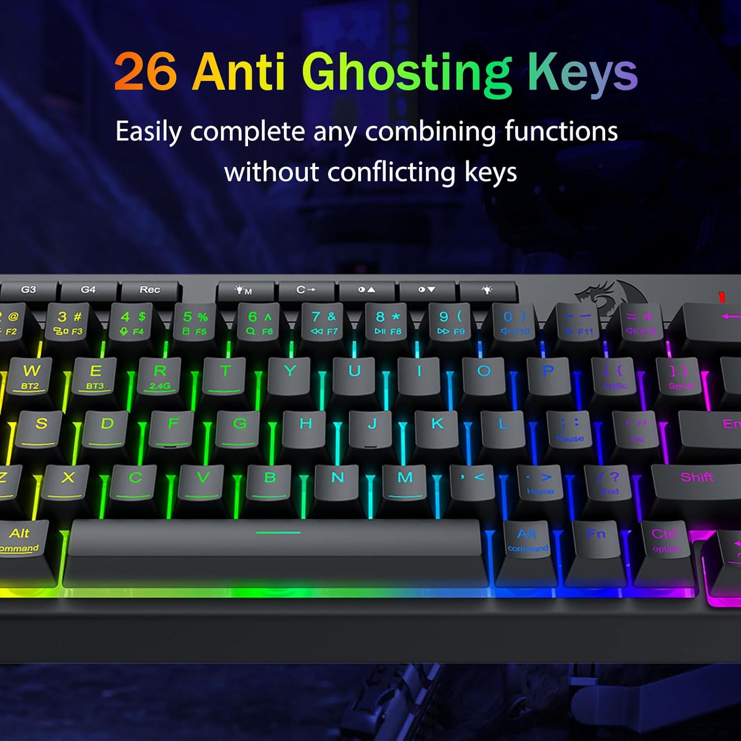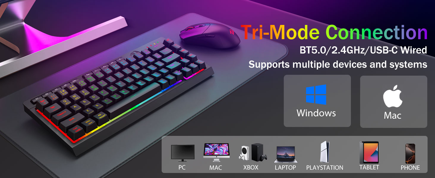 Het zwarte K519 Pro draagbare draadloze gamingtoetsenbord van Redragon, vervaardigd door Chuangquan, is een voorbeeld van professionele techniek voor zowel gamers als professionals. Het veelzijdige tri-mode ontwerp ondersteunt stabiele Bluetooth, 2,4GHz draadloze verbindingen met lage latentie en bekabelde USB-C-verbindingen, waardoor moeiteloos schakelen tussen drie apparaten tegelijk mogelijk is. Het toetsenbord bevat speciale macrotoetsen die volledig kunnen worden aangepast via intuïtieve software, waardoor gebruikers complexe opdrachten of snelkoppelingen kunnen toewijzen voor verbeterde productiviteit en gaming-efficiëntie. Dynamische RGB-verlichting met meerdere effecten personaliseert de opstelling, terwijl N-key rollover en anti-ghosting ervoor zorgen dat elke toetsaanslag nauwkeurig wordt geregistreerd tijdens intensieve sessies.