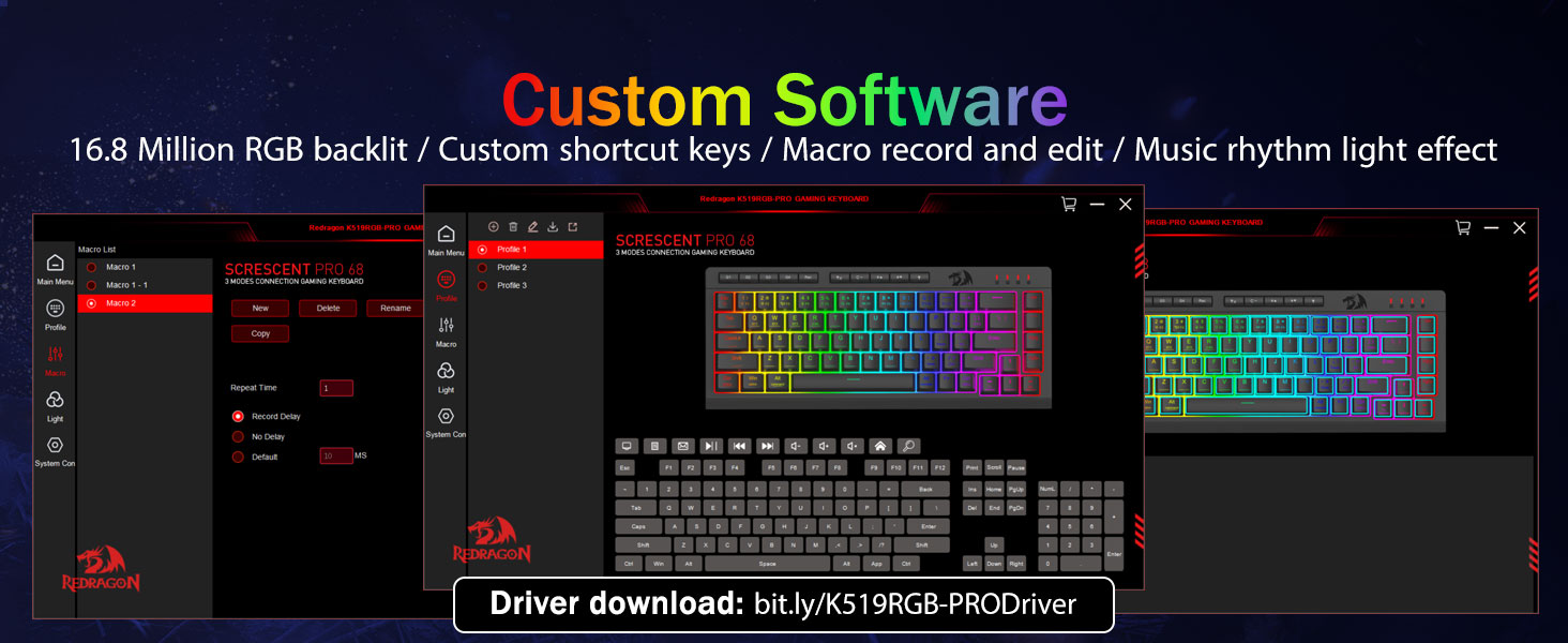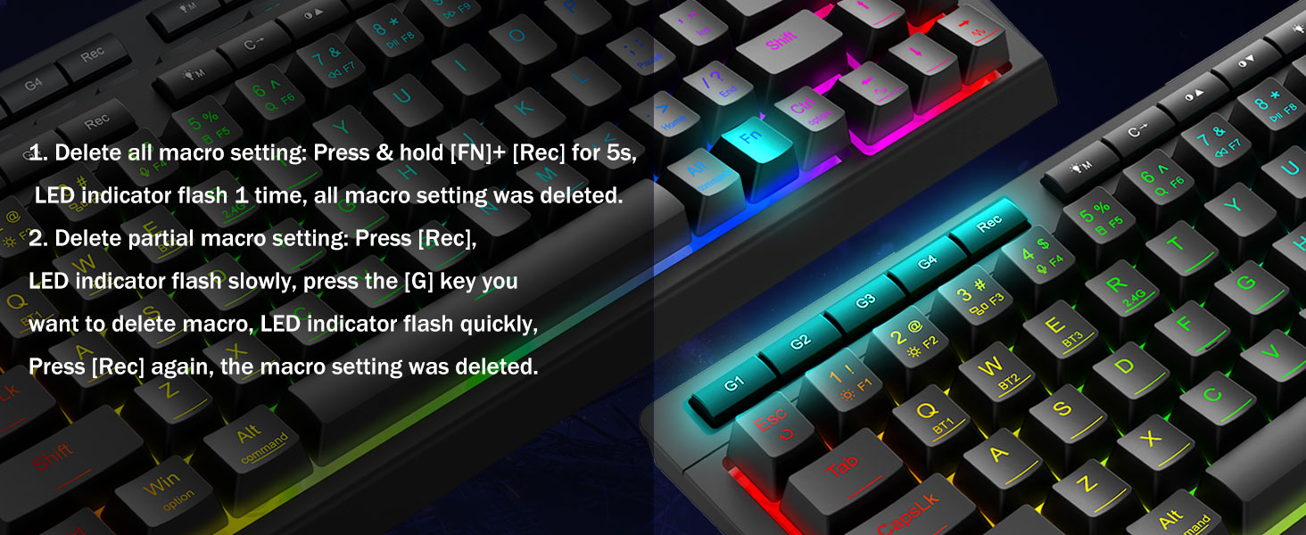 Aanpasbare macro's, moeiteloze bediening -Programmeer de 4 ingebouwde macrotoetsen (G1-G4) direct – geen software vereist. Neem complexe combo's op voor gaming, snelkoppelingen voor productiviteit of mediaopdrachten. Herdefinieer uw workflow in enkele seconden. U kunt ook software gebruiken om functies aan te passen, macro's te maken, RGB-verlichting aan te passen en snelkoppelingen in te stellen. Softwarelink: bit.ly/K524RGB-PRODriver
