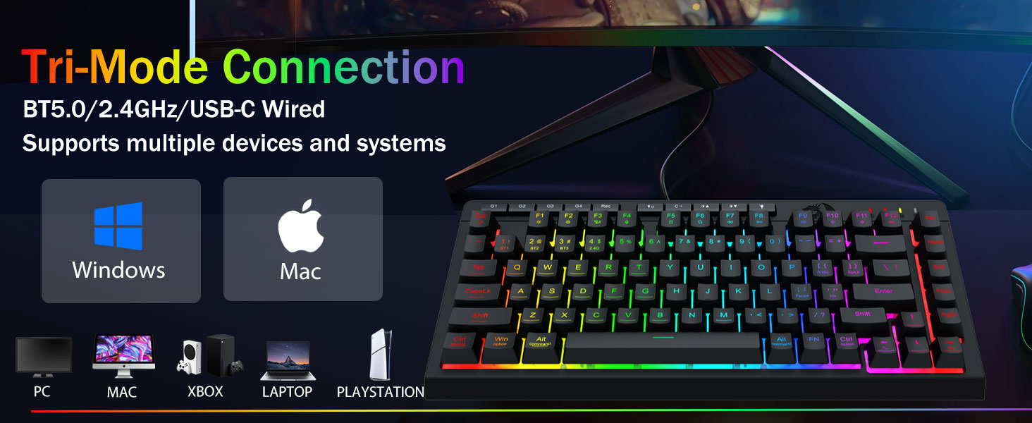 Veelzijdigheid in drie modi en beheersing van meerdere apparaten- Schakel naadloos tussen Bluetooth 5.0, 2,4GHz draadloze of USB-C bekabelde modi, waarbij u maximaal 5 apparaten tegelijk kunt verbinden (pc, Mac, tablets, telefoons, PS/XBOX).