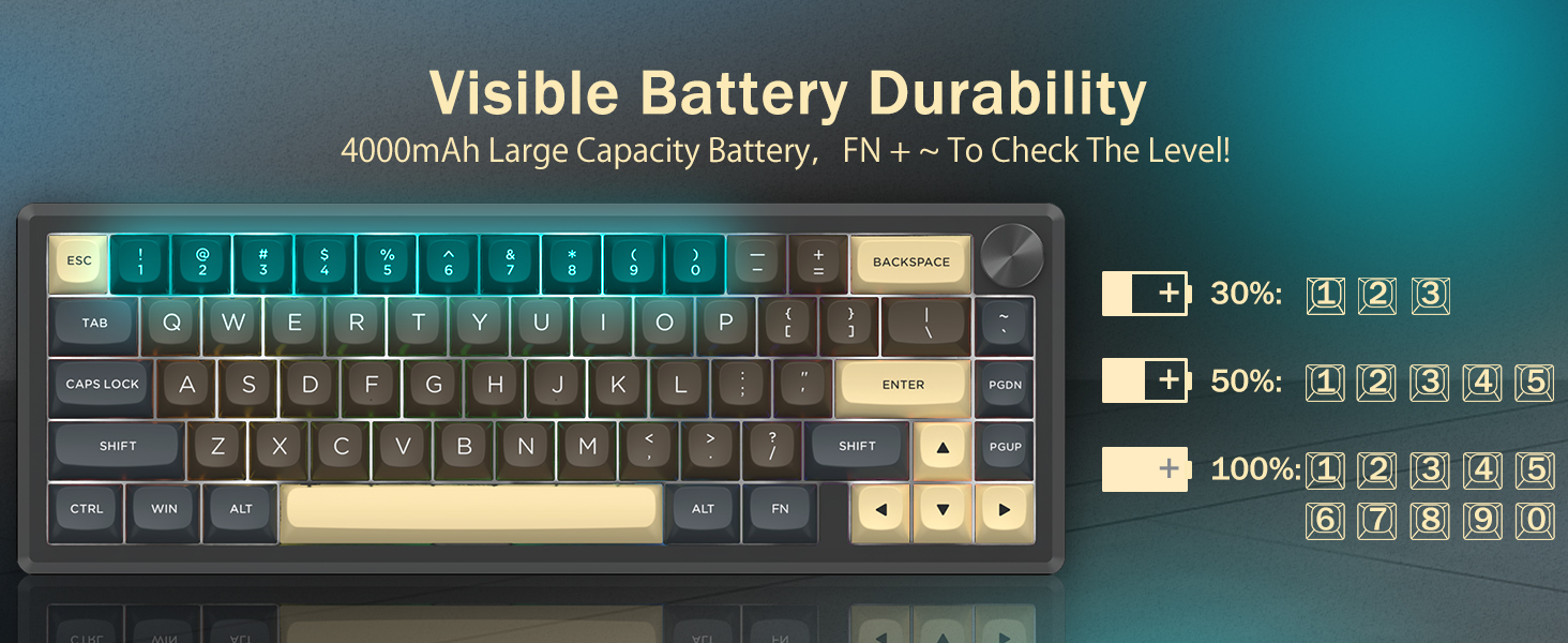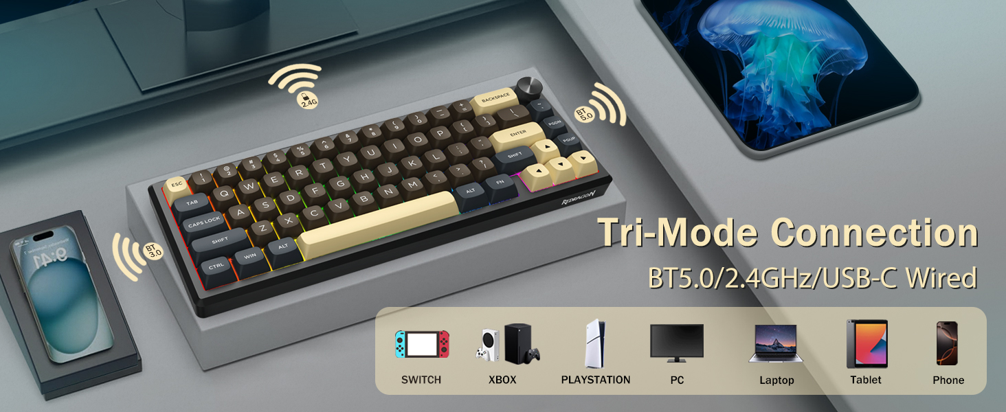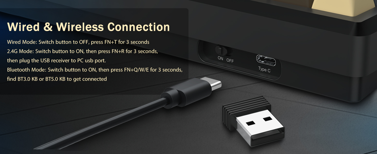 Het toetsenbord ondersteunt draadloze connectiviteit voor gemak en een bekabelde USB-verbinding voor stabiele prestaties. Gebruikers kunnen tussen modi schakelen, afhankelijk van hun opstelling.
