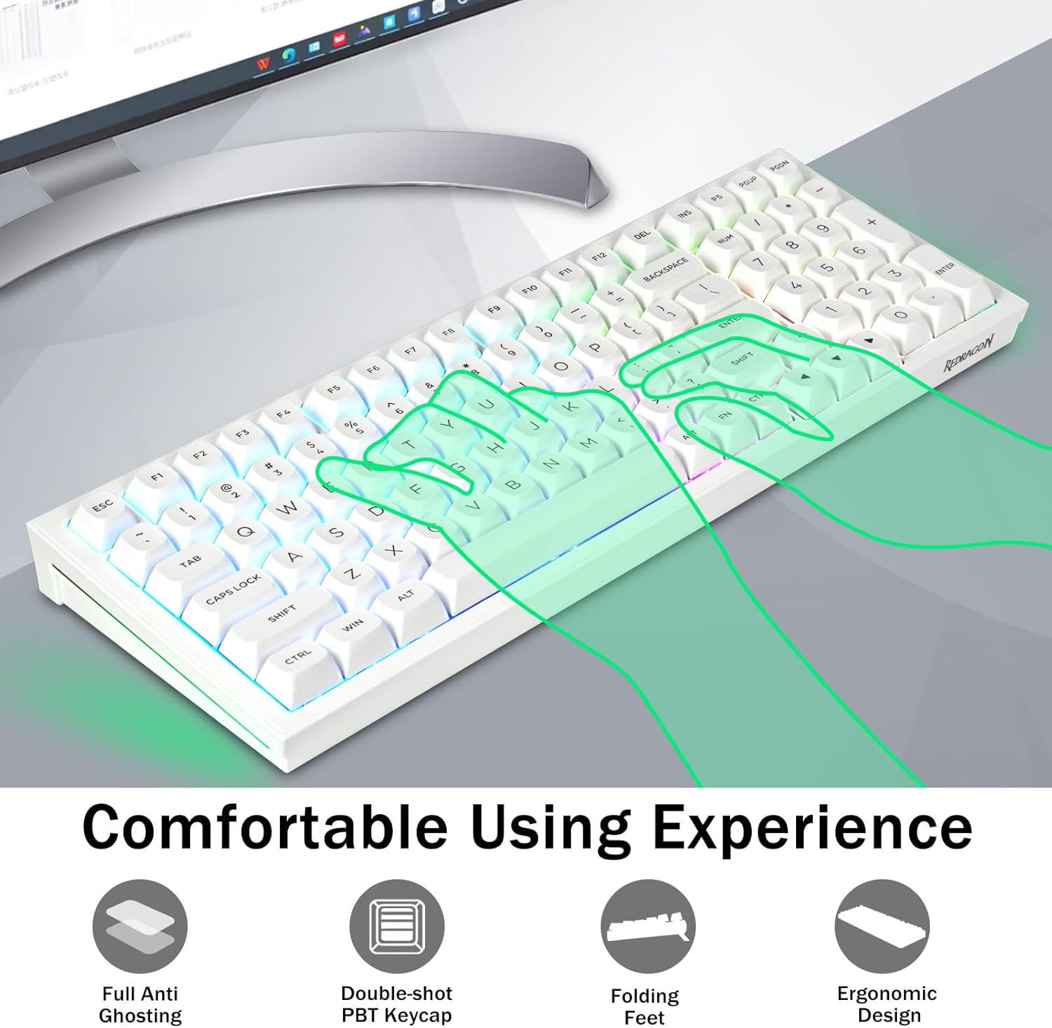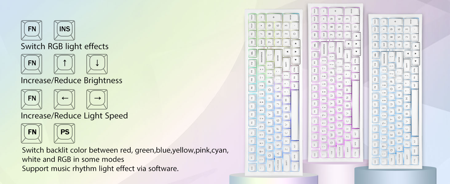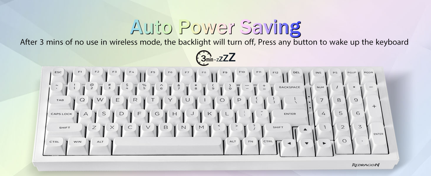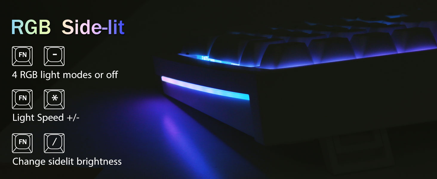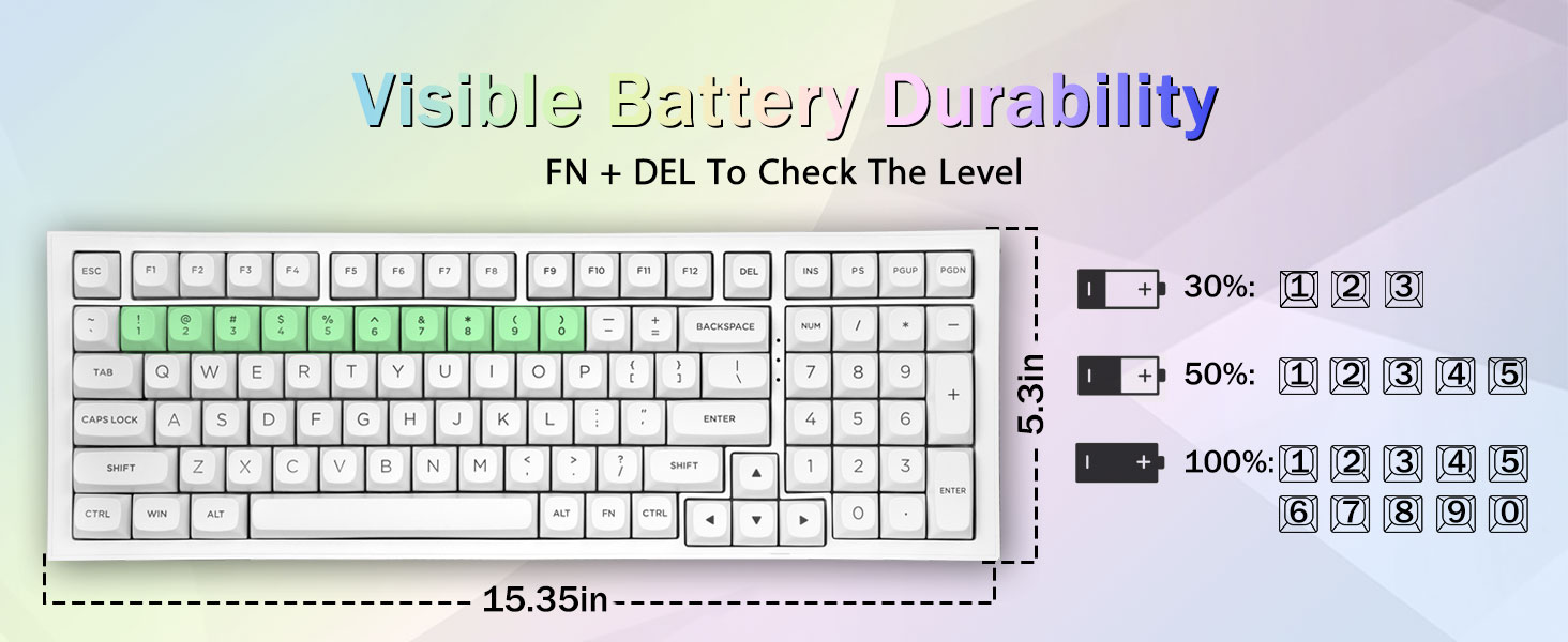 PBT Keycaps en 4000mAh-batterij:Het compacte toetsenbord met 99 toetsen en een indeling van 96% kan meer bureaubladruimte besparen, terwijl de noodzakelijke pijltjestoetsen en cijferruimte voor games en werk behouden blijven. Het oplaadbare toetsenbord heeft een ingebouwde batterij van 4000 mAh met grote capaciteit voor meer kracht en een langere levensduur van de batterij. Dubbelschots PBT-keycaps, gemaakt van twee kleuren materiaal dat in elkaar is gegoten, zorgen ervoor dat de keycaps-karakters de levendigheid en verzadiging behouden, helder zijn en niet vervagen.