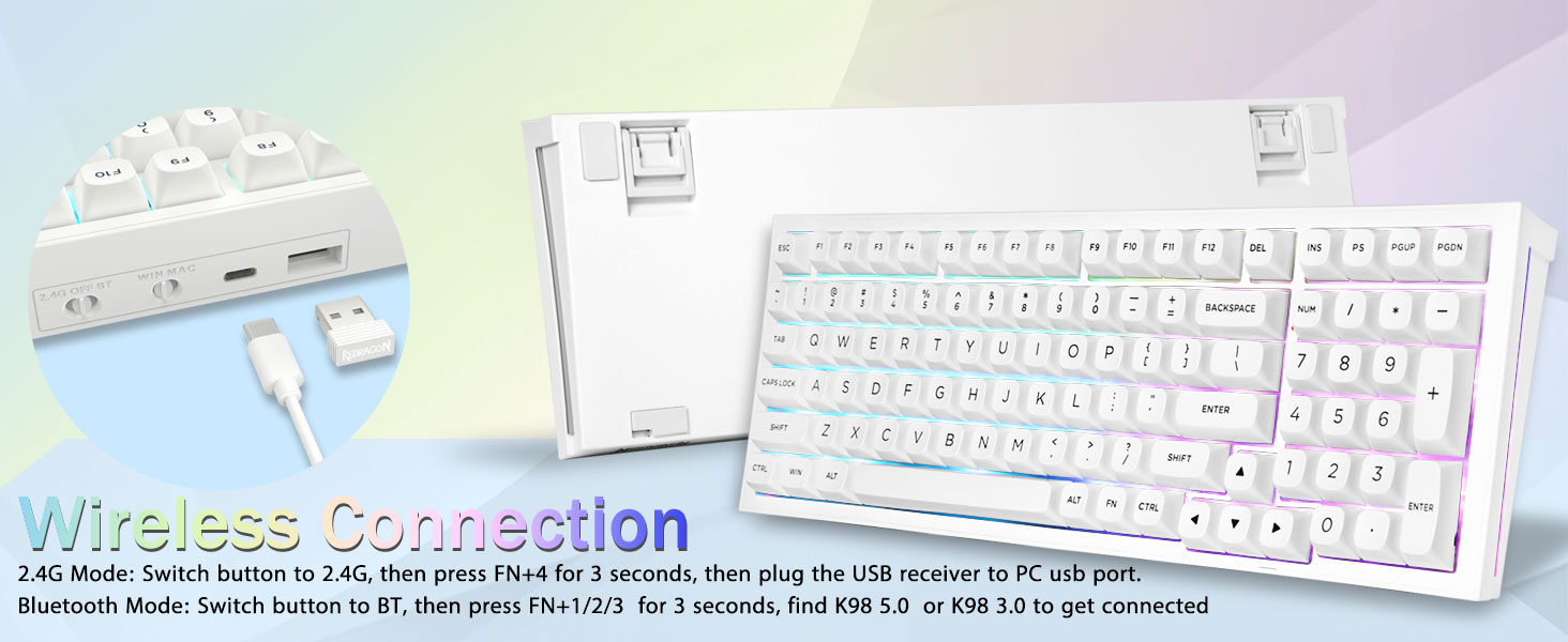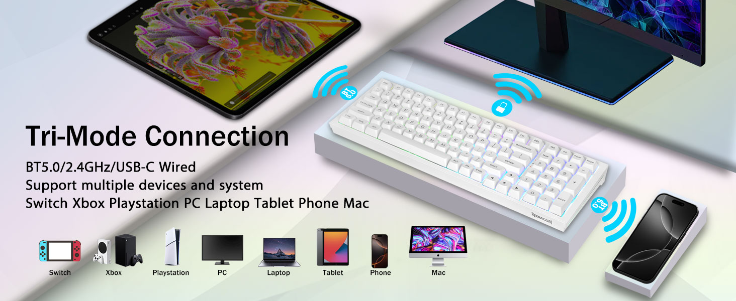 Verbinding met meerdere apparaten:Het Redragon K723 draadloze mechanische toetsenbord biedt drie verbindingsmethoden, waaronder BT5.0, 2,4GHz draadloze modus en USB-bekabelde modus. Het kan met maximaal vijf apparaten tegelijk worden verbonden en kan eenvoudig tussen deze apparaten worden geschakeld met behulp van FN en toetscombinatietoetsen. Geen beperkingen wat betreft uw toetsenbordaansluiting om te voldoen aan de behoeften van werk, gamen en studeren.