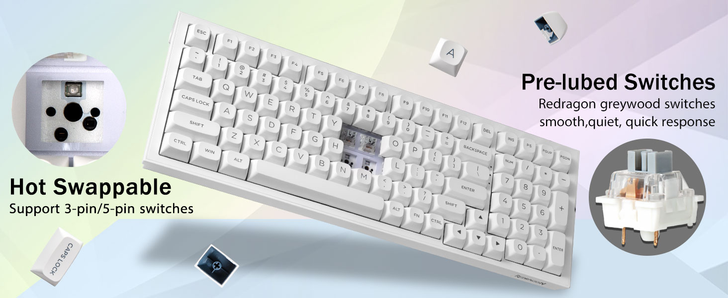 Hot-swappable aangepast toetsenbord:De schakelaars en toetskappen kunnen vrij worden vervangen (toetskap/schakelaartrekker zijn inbegrepen in het pakket). Met dit aanpasbare toetsenbord met hot-swap PCB kunnen gebruikers 3-pins/5-pins schakelaars eenvoudig vervangen zonder soldeerproblemen. K723 mechanische toetsenborden uitgerust met vooraf gesmeerde lineaire schakelaars, zorgen voor een soepel typgevoel en een aangenaam typgeluid, zorgen voor een snelle respons voor spannend spel