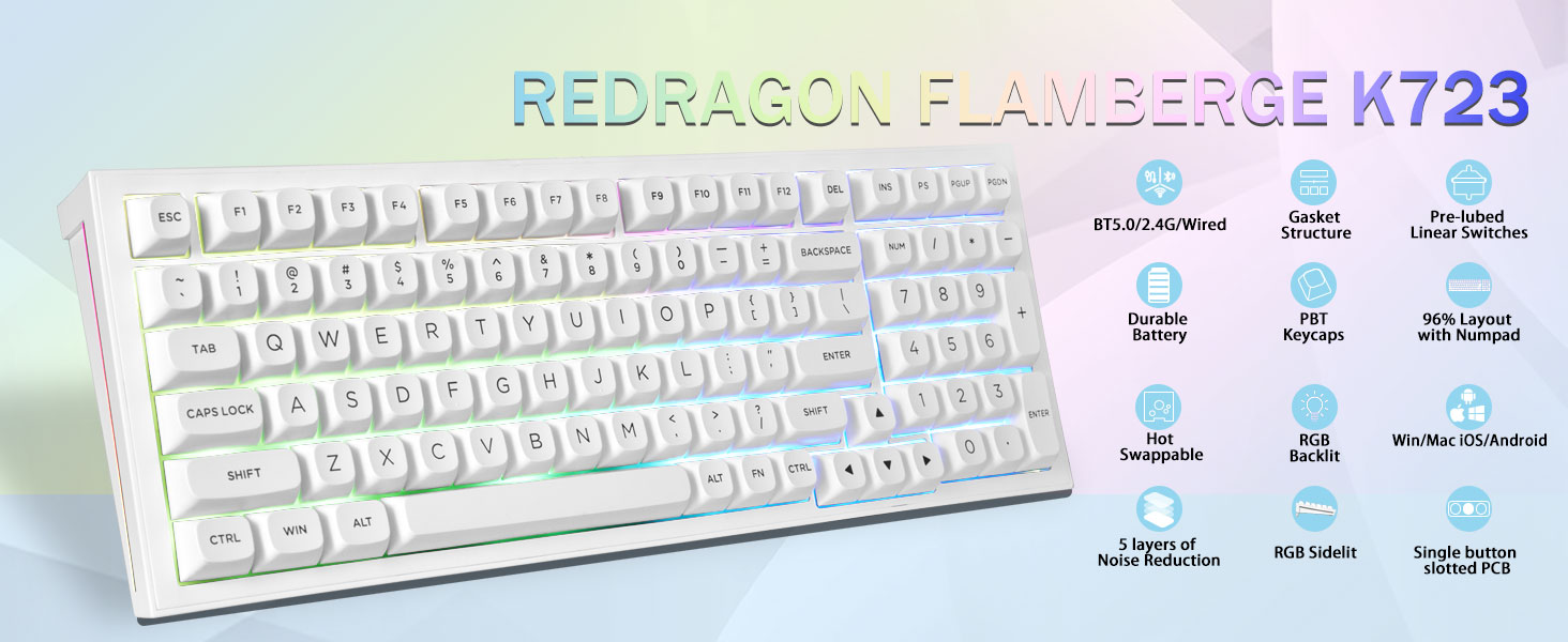 Chuangquan, een toonaangevende Chinese fabrikant, presenteert met trots het Redragon White Creamy K723 draadloze mechanische gamingtoetsenbord: een meesterwerk ontworpen voor gamers die weigeren compromissen te sluiten! Met razendsnelle connectiviteit voor meerdere apparaten, hot-swappable aanpassingen en een pakkingstructuur voor soepele toetsaanslagen levert dit toetsenbord ongeëvenaarde prestaties. Voorgesmeerde schakelaars en levendige achtergrondverlichting zorgen ervoor dat elke druk nauwkeurig en meeslepend is. Als vertrouwde fabriek garandeert Chuangquan concurrerende groothandelsprijzen en OEM/ODM-ondersteuning voor wereldwijde leveranciers die op zoek zijn naar gaminguitrusting van het hoogste niveau. Verbeter uw gameplay: koop vandaag nog rechtstreeks bij Chuangquan!