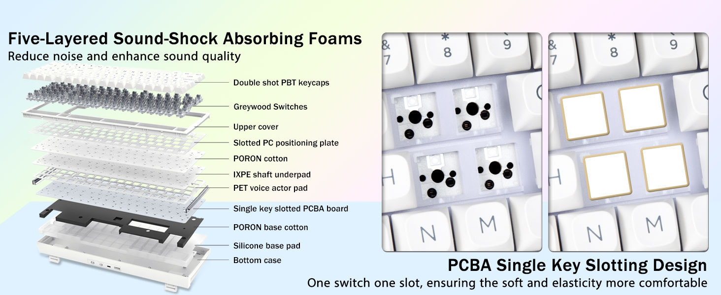 Pakkingstructuur en PCB-sleuven met enkele sleutel:Dit computertoetsenbord is voorzien van een pakkingstructuur, een uitgebreid geïntegreerd siliconenkussen en een PCB-sleuf voor één sleutel, waardoor de veerkracht en stabiliteit beter worden geoptimaliseerd, waardoor de hand zachter en elastischer aanvoelt. Vijf lagen vulgeluiddemper vullen de opening tussen de printplaat, de positioneringsplaat en de as, waardoor het holtegeluid van de as die de positioneringsplaat raakt effectief wordt tegengegaan en een solide gevoel ontstaat.