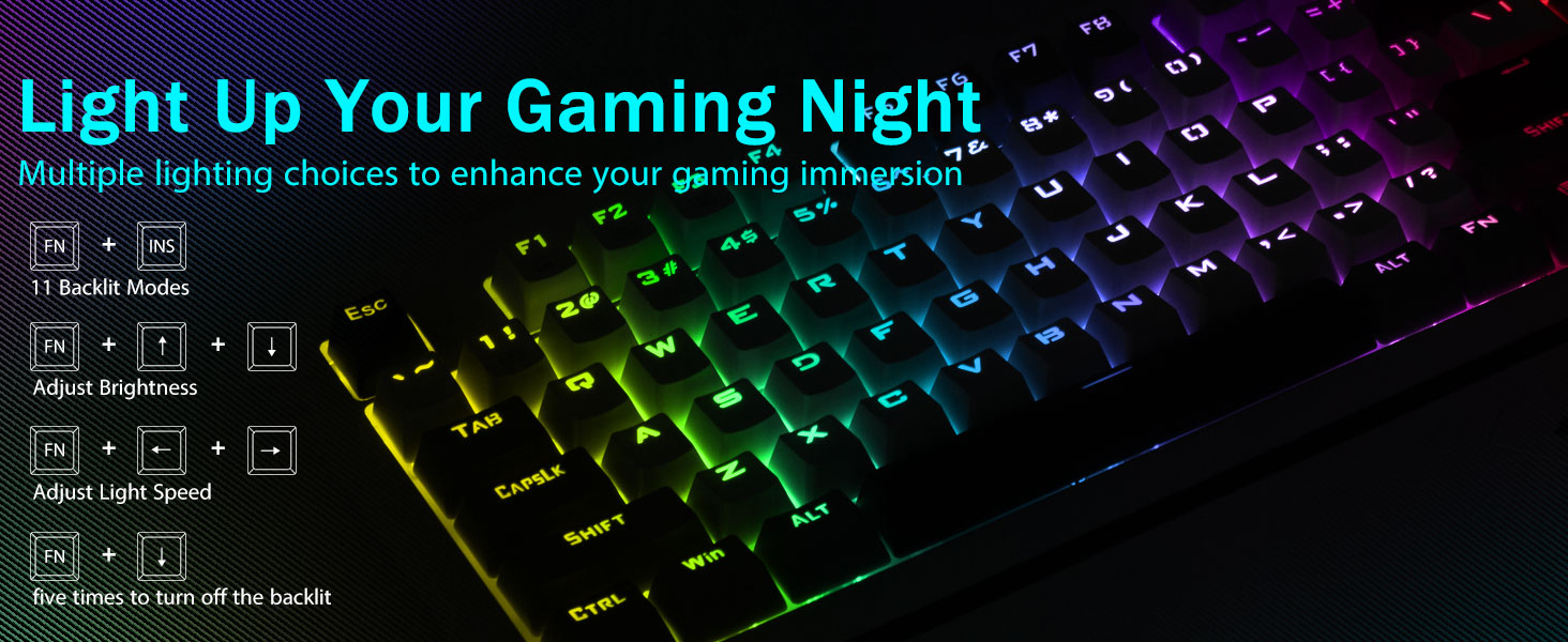 【Regenboogverlicht toetsenbord voor een meeslepende ervaring】Verlicht uw bureaublad met 11 dynamische achtergrondverlichtingsmodi, 5 instelbare niveaus van snelheid en helderheid. Dit toetsenbord is een game-changer voor uw gaming-opstelling en verbetert uw humeur en onderdompeling, vooral in omgevingen met weinig licht. De uiterst duurzame ABS-toetsen met dubbele injectie zorgen voor een kristalheldere, uniforme achtergrondverlichting, waardoor uw typnauwkeurigheid zelfs in het donker wordt verbeterd.